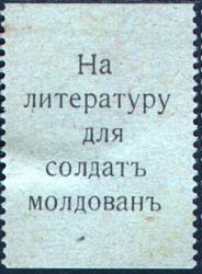 1915 1915(?) г. Разм. 30 х 41 мм. Одноцветная печать на бумаге различных цветов. Вертикальная зубц. 11 1/2. В центре текст в пять строк: «На литературу для солдат молдаван».