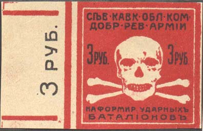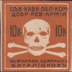 1918 1918 г. Разм. 64 х 42 мм. Двухцветная печать на плотной белой бумаге. В прямоугольной рамке 37 х 37 мм в центре череп со скрещенными костями и номинал. По бокам номинал. Сверху текст в две строки: «Сев[еро]. Кавк[азский]. обл[астной]. ком[итет]. Добр[овольческой]. рев[олюционной]. Армии». Внизу текст в две строки: «На формир[ование]. ударных баталионов».