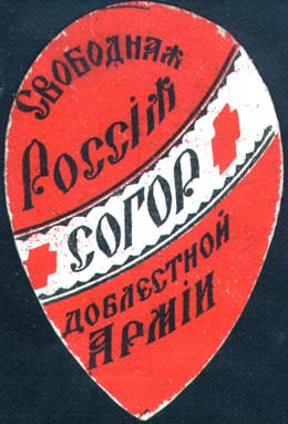 1917 1917 г. Виньетка в виде овала, заостренного в нижней части рамки 42 х 64 мм. Двухцветная печать на толстой белой бумаге. По диагонали лента с аббревиатурой «СОГОР» и двумя красными крестами по краям. Сверху текст: «Свободная Россия». Внизу текст: «Доблестной армии».
