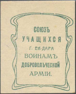 1919 1919 г. Разм. 53 х 64 мм. Одноцветная печать на белой бумаге. В декоративной фигурной рамке разм. 44 х 54 мм текст в шесть строк: «Союз учащихся г. Екатеринодара воинам Добровольческой армии».