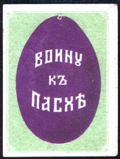 1915 1915(?) г. Разм. рамки 33,5 х 46,5 мм. Двухцветная печать на плотной белой бумаге. В прямоугольной рамке с декоративными углами на цветном фоне в центре пасхальное яйцо. На яйце текст в три строки: «Воину к Пасхе».