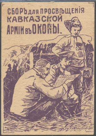 1915 1915(?) г. Разм. 51 х 72 мм. Одноцветная печать на желтоватой бумаге. В центре двое солдат читают газету, третий стоит рядом с книгой. Сверху текст в три строки: «Сбор для просвещения Кавказской Армии в окопы». Внизу справа мелким шрифтом выходные данные: «Лит. Т-ва «Кубань» Екатдар».