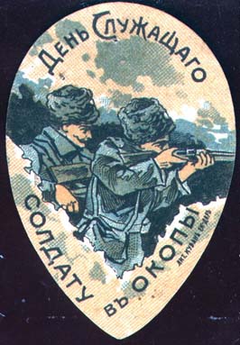 1916 1916 г. 17.04.1916 г. Виньетка в виде овала, заостренного в нижней части разм. 43 х 73 мм. Трехцветная печать на белой бумаге. В центре два солдата с винтовками в окопе. Сверху полукругом текст: «День Служащего». Внизу текст: «Солдату в окопы». Справа параллельно кромке знака мелким шрифтом выходные данные: «Лит. Кубань, Ек-дар».