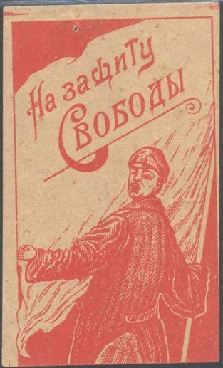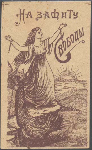 1917 1917 г. Разм. 53 х 82 мм. Одноцветная печать на желтой бумаге. В центре аллегорический рисунок. Женщина с разорванными кандалами на руках, символизирующая свободную Россию, с орлом у ног, символизирующим самодержавие. Сверху текст в две строки: «На защиту свободы».