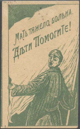 1917 1917 г. Разм. рамки 48 х 81 мм. Одноцветная печать на желтой бумаге. В прямоугольной рамке солдат со знаменем в правой руке. На знамени текст в две строки: «Мать тяжело больна. Дети Помогите!».