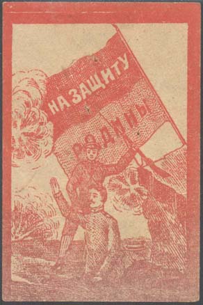 1917 1917 г. Разм. 48 х 73 мм. Одноцветная печать на желтой бумаге. В центре двое солдат на фоне флага России и разрывов снарядов. На знамени текст в две строки: «На защиту Родины».