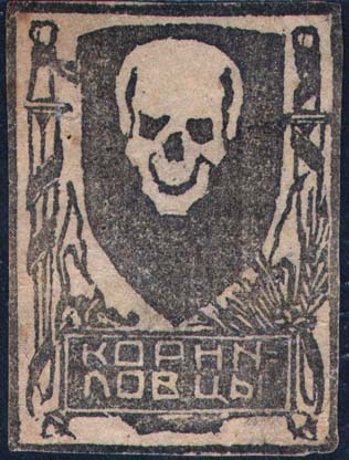 1919 1919(?) г. Разм. 50 х 69 мм. Одноцветная печать низкого качества на тонкой серой бумаге. В прямо-угольной рамке в центре на фигурном щите эмблема Корниловцев. По краям щита два меча перевитых лентами. Внизу в двойной прямо-угольной рамке текст в две строки: «Корниловцы».