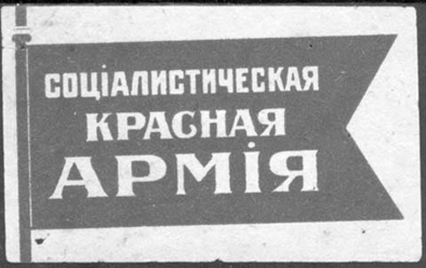 1920 1920(?) г. Разм. 78 х 48 мм. Одноцветная печать на желтоватой бумаге. Красный флаг с вырезом справа в форме фестона. На флаге текст в три строки: «Социалистическая Красная Армия».
