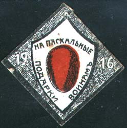 1916 1916 г. Ромб разм. 41 х 41 мм. Двухцветная печать на толстой белой бумаге. В центре фигурный щиток разм. 22 х 32 мм. На щитке пасхальное яйцо и текст: «На пасхальные подарки воинам». По бокам щитка дата: «1916».