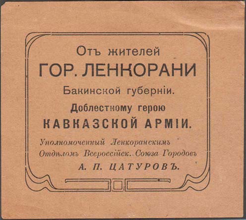 1915 1915(?) г. Разм. 82 х 72 мм. Одноцветная печать на бумаге различных цветов. В центре в декоративной рамке с закругленными краями текст в восемь строк: «От жителей гор. Ленкорани Бакинской губернии. Доблестному герою Кавказской армии. Уполномоченный Ленкоранским Отделом Всероссийск[ого]. Союза Городов А.П. Цатуров».