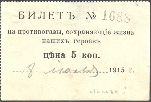 1915 1915 г. Разм. 85 х 57 мм. Одноцветная печать на белой бумаге. Зубц. 11 1/2. Текст в пять строк: «БИЛЕТ №... на противогазы, сохраняющие жизнь наших героев Цена 5 коп. ...(Дата) 1915 г.».