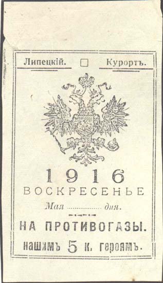1916 1916 г. Май. Разм. рамки 47 х 69 мм. Одноцветная печать на белой бумаге. В двойной прямоугольной рамке в центре герб России. Внизу текст в пять строк: «1916. ВОСКРЕСЕНЬЕ Мая ... дня. На противогазы нашим 5 к. героям». Сверху текст: «Липецкий Курорт».