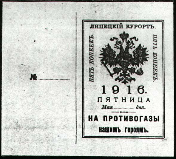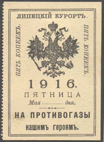 1916 1916 г. Май. Квитанция. Разм. рамки 47 х 69 мм. Одноцветная печать на бумаге различных цветов. Левосторонняя зубц. 11 1/2. В двойной прямо-угольной рамке в центре герб России. Внизу текст в пять строк: «1916. ... (День недели) Мая ... дня. На противогазы нашим героям». Сверху текст: «Липецкий курорт». Слева и справа от герба вертикально номинал: «Пять копеек».
