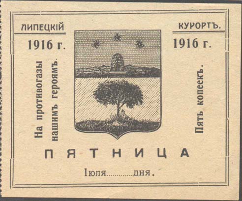 1916 1916 г. Июль. Квитанция. Разм. рамки 74 х 60 мм. Одноцветная печать на бумаге различных цветов. Левосторонняя зубц. 11 1/2. В двойной прямоугольной рамке в центре герб города Липецка. Сверху текст: «Липецкий курорт. 1916 г.». Слева вертикально текст в две строки: «На противогазы нашим героям». Справа номинал: «Пять копеек». Внизу текст в две строки: «... (День недели) Июля .... дня».