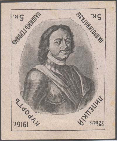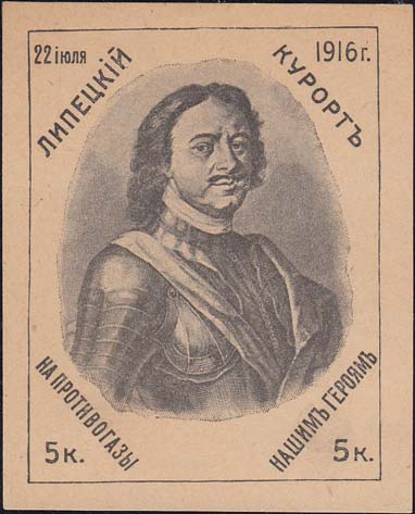 1916 1916 г. Июль Разм. рамки 55 х 70 мм. Одноцветная печать на бумаге различных цветов. Портрет Петра I в доспехах. Сверху текст: «22 июля 1916 г.». Вокруг портрета текст: «Липецкий курорт на противогазы нашим героям».