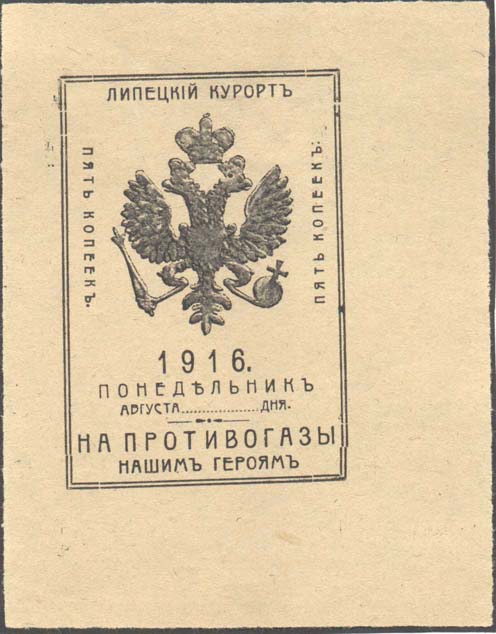 1916 1916 г. Август. Квитанция. Разм. рамки 47 х 69 мм. Одноцветная печать на белой бумаге. Левосторонняя зубц. 11 1/2. В двойной прямоугольной рамке стилизованное изображение герба России. Сверху текст: «Липецкий курорт». Слева и справа от герба вертикально номинал: «Пять копеек». Внизу текст в пять строк: « «1916. ПОНЕДЕЛЬНИК Августа ... дня. На противогазы нашим героям».