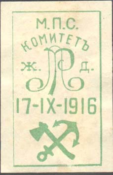 1916 1916 г. 17.09.1916 г. Разм. рамки 30 х 52 мм. Одноцветная печать на белой бумаге. В рамке текст в четыре строки: «М.П.С. Комитет Л.Р.Ж.Д. 17/IX.1916». Внизу путейский значок.