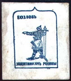 1915 1915(?) г. Разм. 40 х 47 мм. Одноцветная печать на толстой белой бумаге. В центре в рамке в форме перевернутого геральдического щита русский воин в доспехах и с мечом. Текст в две строки: «Козлов защитникам Родины».