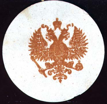 1915 1915(?) г. Круг диаметром 60 мм. Одноцветная печать на белой бумаге. В центре герб России.