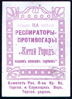 1915 1915 г. 23.-26.06.1915 г. Разм. 47 х 63 мм. Одноцветная печать на белой глянцевой бумаге. В центре в декоративной рамке разм. 40 х 50 мм текст в пять строк: «На респираторы-противогазы «Китай Город нашим воинам героям»». Внизу под рамкой текст в две строки: «Комитет Рос[сийского]. О-ва Кр[асного]. Кр[еста]. Торгов[цев]. и Служащих Верх[них]. Торг[овых]. рядов».