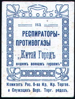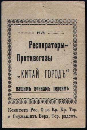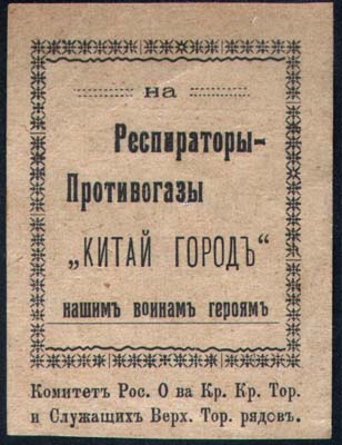 1915 1915 г. 23.-26.06.1915 г. Разм. 49 х 75 мм. Одноцветная печать на бумаге различных цветов. В центре в декоративной рамке разм. 41 х 50 мм текст в пять строк: «На респираторы-противогазы «Китай Город нашим воинам героям»». Внизу под рамкой текст в две строки: «Комитет Рос[сийского]. О-ва Кр[асного]. Кр[еста]. Торгов[цев]. и Служащих Верх[них]. Торгов[ых]. Рядов».
