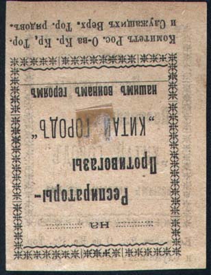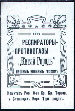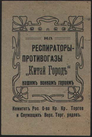 1915 1915 г. 23.-26.06.1915 г. Разм. 50 х 73 мм. Одноцветная печать на толстой желто-серой бумаге. В центре в декоративной рамке разм. 40 х 50 мм текст в пять строк: «На респираторы-противогазы «Китай Город нашим воинам героям»». Внизу под рамкой текст в две строки: «Комитет Рос[сийского]. О-ва Кр[асного]. Кр[еста]. Торгов[цев]. и Служащих Верх[них]. Торг[овых]. Рядов».