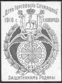 1916 1916 г. Разм 35 х 47 мм. Двухцветная печать на толстой сероватой бумаге с фоном. В центре эмблема торгово-промышленной палаты(?) в обрамлении венка. Сверху герб Нижнего Новгорода. Текст: ««День торговых служащих» 1916 г. Н.Новгород. Защитникам Родины».