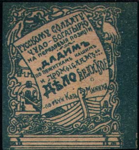 1916 1916(?) г. Разм. 47 х 58 мм. Одноцветная печать на бумаге различных цветов. В декоративной рамке ладья на фоне собора. На парусе ладьи сверху текст в три строки: «Русскому солдату – чудо-богатырю на передовые позиции». Ниже текст в пять строк: ««Дадим по пожиткам нашим и промыслам... Дело великое» - По речи Козьмы Минина».