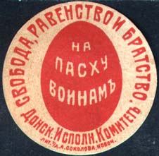 1917 1917 г. Круг диаметром 37 мм. Одноцветная печать на желтоватой бумаге. В центре пасхальное яйцо, на котором текст в три строки: «На пасху воинам». По окружности текст: «Свобода, Равенство и Братство. Донск[ой]. Исполн[ительный]. Комитет». Внизу полукругом выходные данные мелким шрифтом: «Лит. Т/Д. А.Соколова. Новоч.».