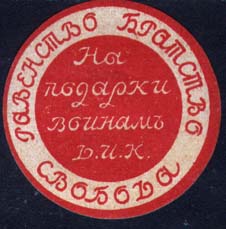 1917 1917 г. Круг диаметром 37 мм. Одноцветная печать на желтоватой бумаге. В центре на фоне круга диа-метром 25 мм текст в четыре строки: «На подарки воинам. Д.И.К.». По окружности текст: «Свобода, равенство, братство».