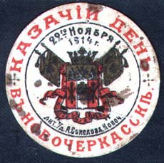 1914 1914 г. 22.11.1914 г. Круг диаметром 37 мм. Трехцветная печать на желтоватой бумаге. В центре в круглой рамке диаметром 27 мм герб Донского Казачьего Войска. Сверху в две строки полукругом дата: «22–го ноября 1914 г.». Внизу полукругом выходные данные мелким шрифтом: «Лит. Т/Д А.Соколова. Новоч.». С наружной стороны рамки по окружности текст: «Казачий день в Новочеркасске».