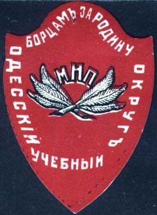 1915 1915(?) г. Виньетка в виде фигурного щитка сложной формы разм. 36 х 51 мм. Двухцветная печать на тол-стой белой бумаге. В центре две скрещенные лавровые ветви и аббревиатура «МНП». По периметру текст: «Борцам за Родину Одесский учебный округ».