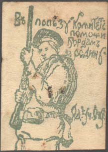 1915 1915(?) г. Разм. 36 х 51 мм. Одноцветная печать на желтоватой бумаге. В центре солдат с винтовкой в руках. Сверху справа текст в четыре строки: «В пользу комитета помощи борцам за Родину». Внизу справа текст: «Од[есская]. Уч[ительская]. Орг[анизация].»
