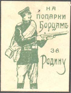 1916 1916 г. 03.04.1916 г. Разм. 34 х 51 мм. Одноцветная печать на желтоватой бумаге. Слева солдат с винтовкой наперевес. Справа текст в пять строк: «На подарки борцам за Родину».