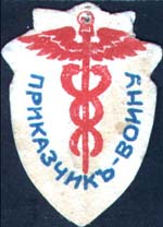 1915 1915 г. Виньетка сложной формы разм. Разм. 25 х 35 мм. Одноцветная печать на толстой белой бумаге. В центре жезл Меркурия. Внизу полукругом текст: «Приказчик - воину».