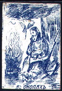 1915 1915(?) г. Разм. 32 х 48 мм. Одноцветная печать на желтоватой бумаге с мелованным верхним слоем. Солдат в зимнем обмундировании у костра в окопе с перекрытием. Внизу текст в одну строку: «В окопах».