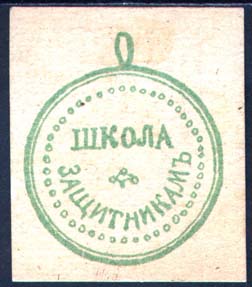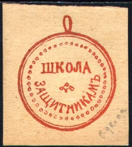 1916 1916 г. Разм. 40 х 47 мм. Одноцветная печать на толстой желтоватой бумаге. В центре круглая медаль диаметром 33 мм с ушком. Текст: «Школа защитникам».
