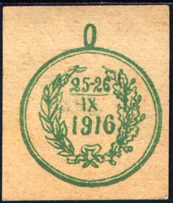 1916 1916 г. 25.-26.09.1916 г. Разм. 40 х 47 мм. Одноцветная двухсторонняя печать на толстой желтоватой бумаге. Лицевая сторона аналогична предыдущему выпуску. На оборотной стороне в центре круглая медаль диаметром 33 мм с ушком. В венке их дубовых и лавровых листьев дата: «25-26.09.1916».