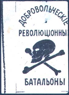 1917 1917 г. Разм. 33 х 51 мм. Одноцветная печать на сероватой бумаге. В центре череп со скрещенными костями. Сверху полукругом текст: «Добровольческие революционные батальоны».
