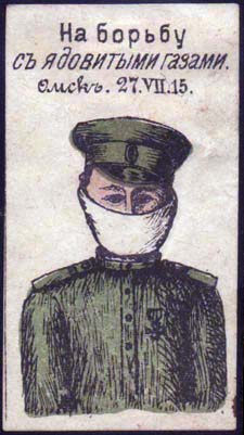1915 1915 г. 27.07.1915 г. Разм. 37 х 67 мм. Трехцветная печать на белой бумаге. В центре солдат в противогазной маске. Сверху текст в три строки: «На борьбу с ядо-витыми газами. Омск. 27.VII.15.».
