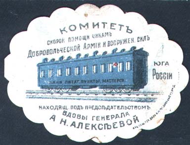 1919 1919(?) г. Виньетка в форме овала с фигурными краями разм. ≈ 64 х 48 мм. Двухцветная печать на сероватой бумаге с мелованным верхним слоем. В центре служебный вагон на рельсах. На вагоне надпись: «Бани, питат[ельные]. пункты, мастерск[ие].». Сверху и справа текст в пять строк: «Комитет скорой помощи чинам Добро-вольческой Армии и вооружен[ым]. Силам юга России». Внизу продолжение текста в три строки: «Находящийся под председательством вдовы генерала А.Н.Алексеевой». Внизу справа мелким шрифтом выходные данные: «Акц. Общ. Печ. дела А.М.Гордон с С-м Р. Н/Д.».