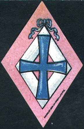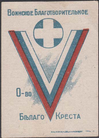 1919 1919 г. Разм. 60 х 78 мм. Двухцветная печать на сероватой бумаге с мелованным верхним слоем. В центре нарукавный шеврон добровольческой армии. Сверху в круглой рамке диаметром 17 мм белый крест. Сверху текст: «Воинское Благо-творительное». Внизу продолжение текста в две строки: «О-во Белого Креста». Внизу справа мелким шрифтом выходные данные: «Акц. Общ. Печ. дела А.М.Гордон с С-м Р. Н/Д.».