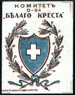 1919 1919 г. Разм. 41 х 53 мм. Двухцветная печать на сероватой бумаге с мелованным верхним слоем. В центре в обрамлении лаврового венка фигурный щиток с белым крестом в центре. Сверху текст в три строки: «Комитет о-ва «Белого Креста»». Внизу слева мелким шрифтом выходные данные: «Акц. Общ. Печ. дела А.М.Гордон с С-м Р. Н/Д.». По углам знака разграничительные линии.