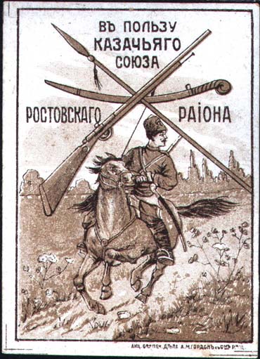 1917 1917 г. 21.08.1917 г. Разм. рамки 56 х 80 мм. Двухцветная печать на сероватой бумаге с мелованным верхним слоем. В центре скачущий на лошади казак. Сверху скрещенные винтовка, шашка и пика. Внизу слева под рамкой мелким шрифтом выходные данные: «Акц. Общ. Печ. дела А.М.Гордон с С-м Р. Н/Д.».