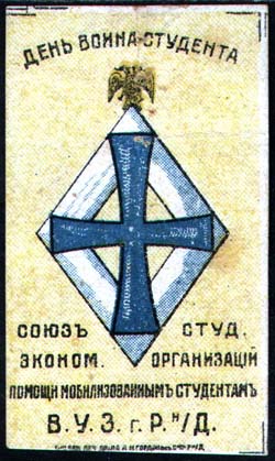 1917 1917 г. Разм. 40 х 68 мм. Трехцветная печать на желтоватой бумаге с мелованным верхним слоем. В центре знак выпускника университета. Орел без царских регалий. Сверху полукругом текст: «День воина-студента». Внизу текст в четыре строки: «Союз студ[ческих]. Эконом[ических]. организаций помощи мобилизованным студентам В.У.З. г. Р. н/Д.». Внизу мелким шрифтом выходные данные: «Акц. Общ. Печ. дела А.М.Гордон с С-м Р. н/Д.».