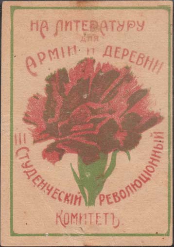 1917 1917(?) г. Разм. 60 х 85 мм. Двухцветная печать на желтоватой бумаге. В прямоугольной рамке разм. 56 х 79 мм в центре цветок гвоздики. Сверху текст в три строки: «На литературу для армии и деревни». Внизу текст в две строки: «Студенческий Революционный Комитет».