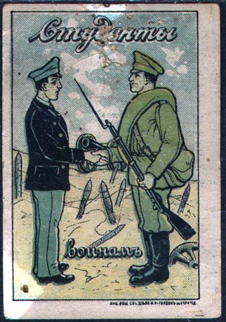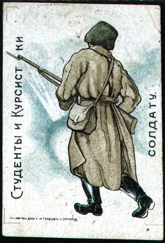 1915 1915(?) г. Разм. 58 х 79 мм. Многоцветная печать на белой мелованной бумаге. В прямоугольной рамке разм. 46 х 71 мм в центре студент в форме и солдат с полным вооружением пожимают друг другу руки на фоне проволочных заграждений и орудия. Текст: «Студенты воинам». Внизу справа под рамкой мелким шрифтом выходные данные: «Акц. Общ. Печ. дела А.М.Гордон с С-м Р. н/Д.».