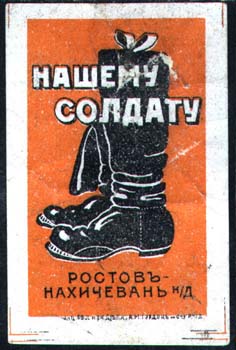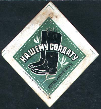 1915 1915(?) г. Ромб разм. Разм. 67 х 70 мм. Двухцветная печать на сероватой бумаге с мелованным верхним слоем. В центре в ромбовидной рамке пара солдатских сапог. Полукругом текст: «Нашему солдату». Справа внизу вдоль рамки текст: «Ростов-Нахичевань Н/Д». Внизу слева под рамкой мелким шрифтом выходные данные: «Акц. Общ. Печ. дела А.М.Гордон с С-м Р. н/Д.».