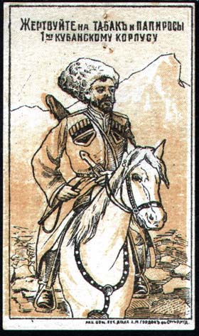 1915 1915(?) г. Разм. рамки 43 х 74 мм. Двухцветная печать на сероватой бумаге с мелованным верхним слоем. В центре казак Кубанского Казачьего Войска с полным вооружением на коне на фоне гор. Сверху текст в две строки: «Жертвуйте на табак и папиросы 1-му Кубанскому корпусу». Внизу справа под рамкой мелким шрифтом выходные данные: «Акц. Общ. Печ. дела А.М.Гордон с С-м Р. н/Д.».