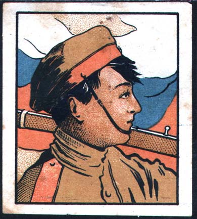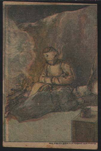 1915 1915(?) г. Разм. рамки ≈ 51 х 76 мм. Многоцветная печать на толстой желтоватой бумаге. В центре двое солдат в заснеженном окопе греются у костра. Слева внизу под рамкой выходные данные мелким шрифтом: «Акц. Общ. Печ. дела А.М.Гордон с С-м Р. н/Д.».